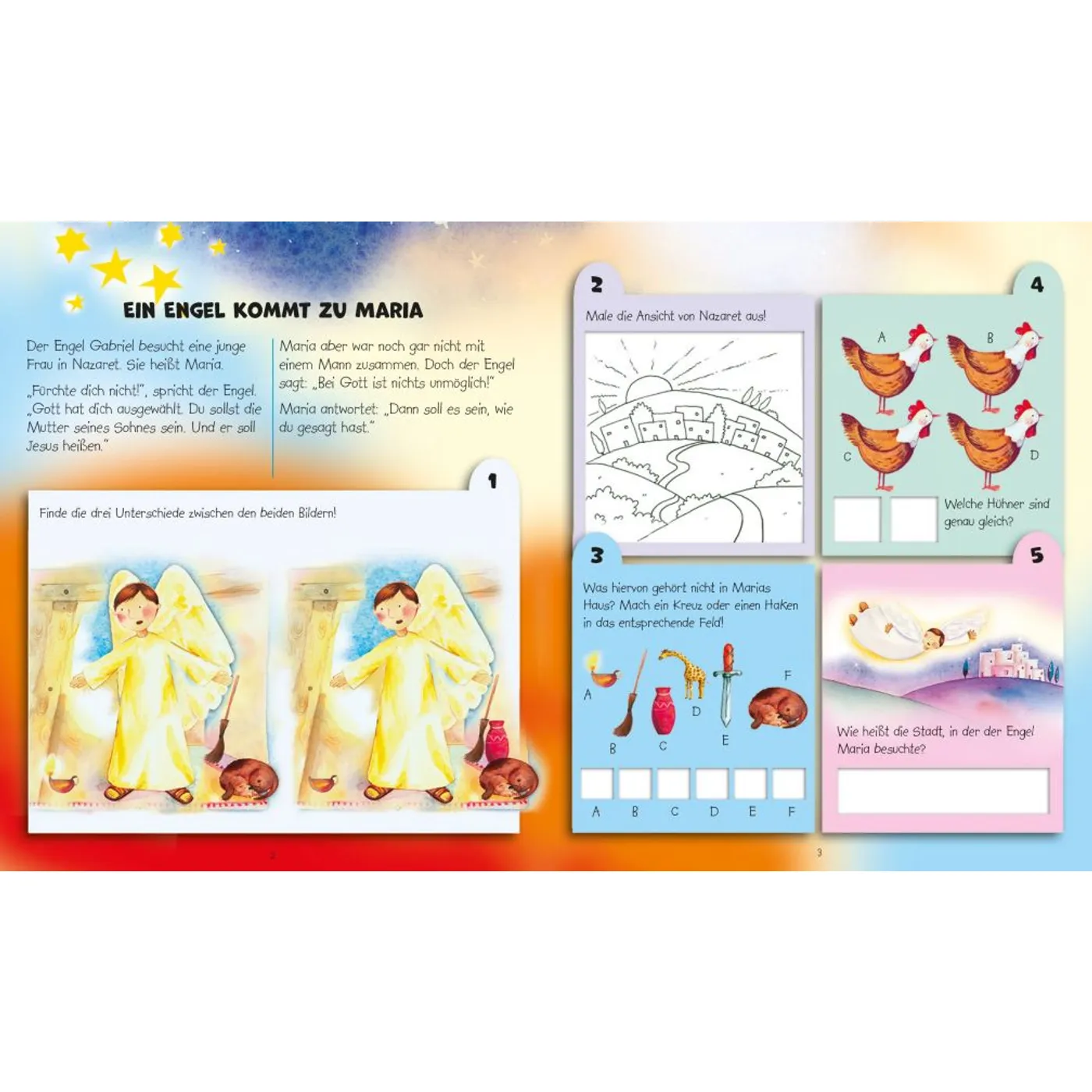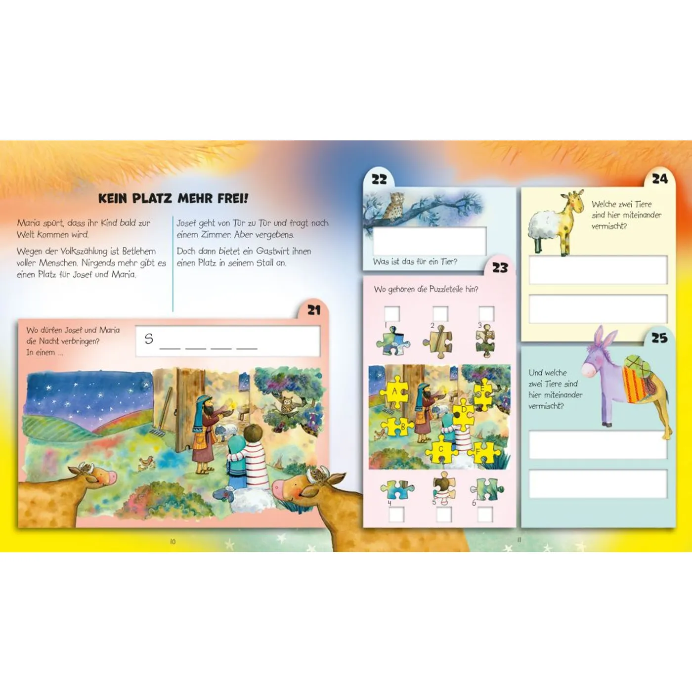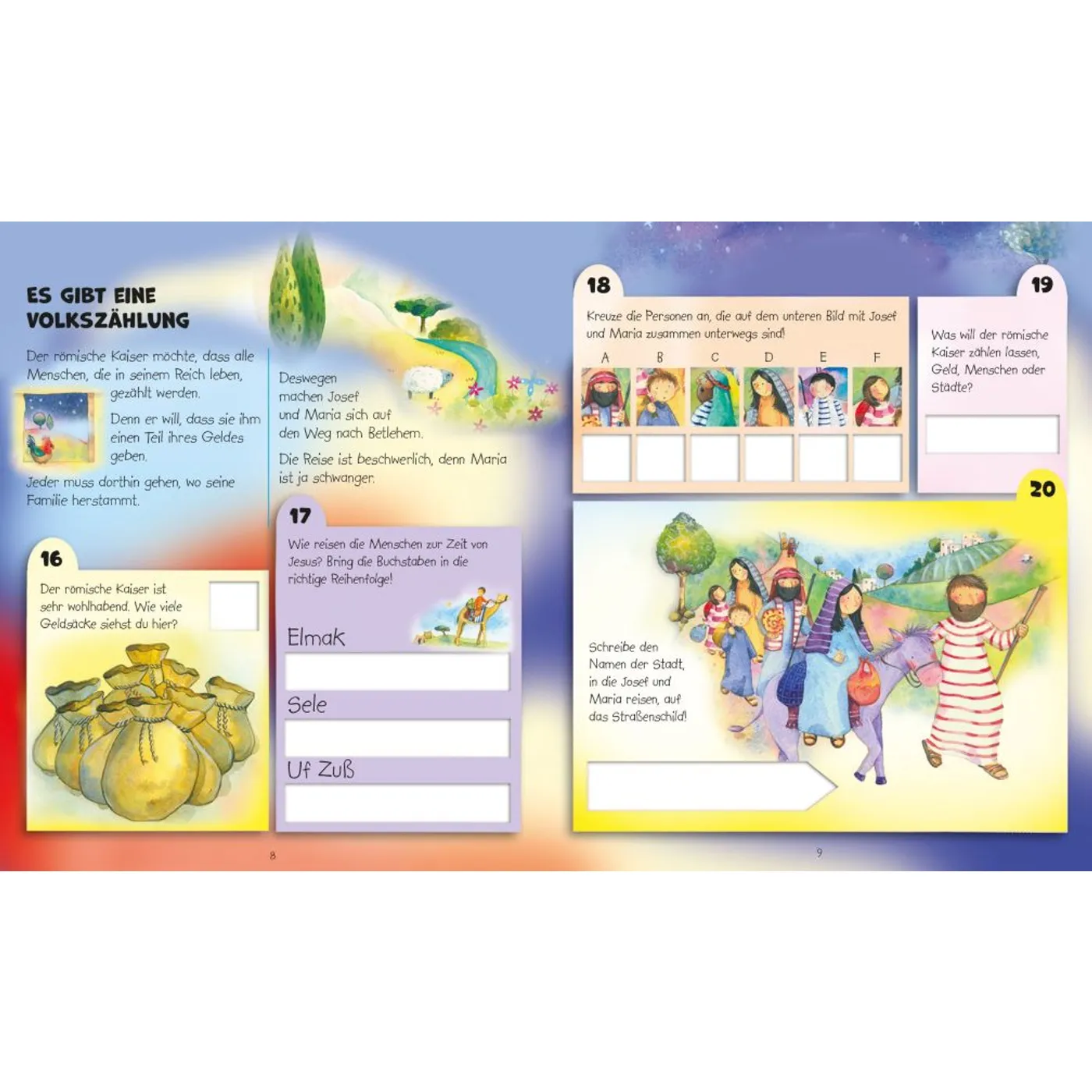 Das Rätselheft „101x Bibelspass – Weihnachten“ von der deutschen Bibelgesellschaft ist ideal für kleinere und größere Entdecker im Grundschulalter, die ihr Wissen rund um die biblische Weihnachtsgeschichte vertiefen und auf spielerischem Wege Jesus kennen lernen möchten. Es enthält die Geschichte aufgeteilt in 20 Einzelerzählungen, die auf den jeweiligen Doppelseiten zu finden sind.