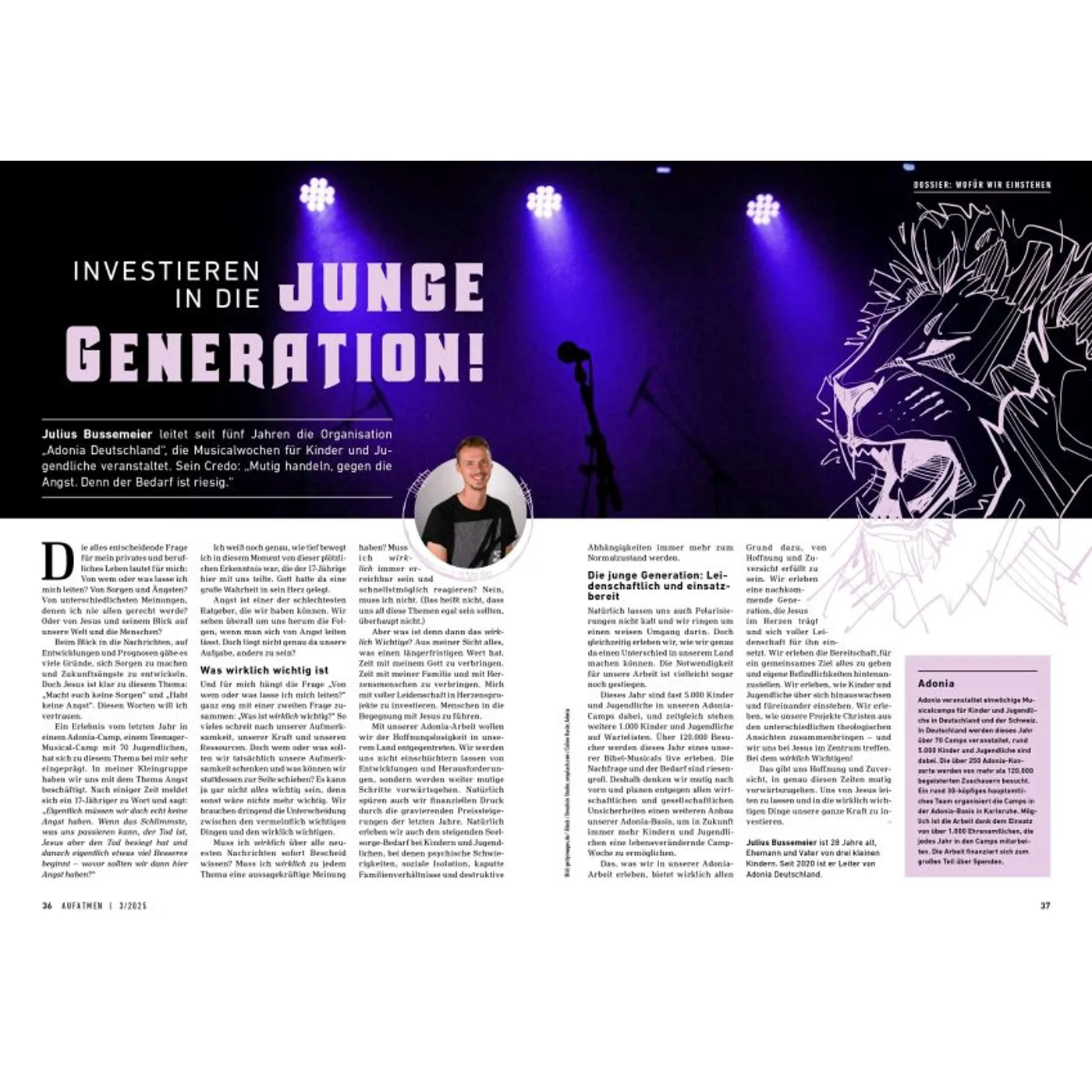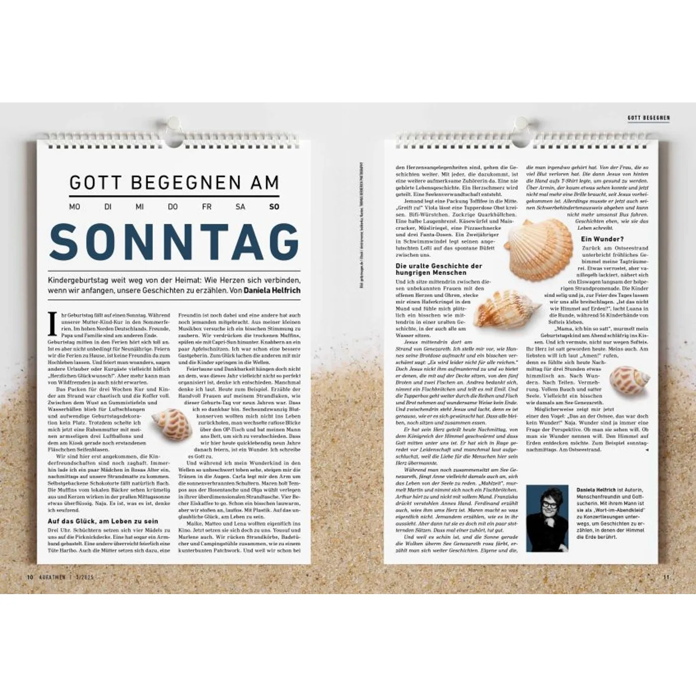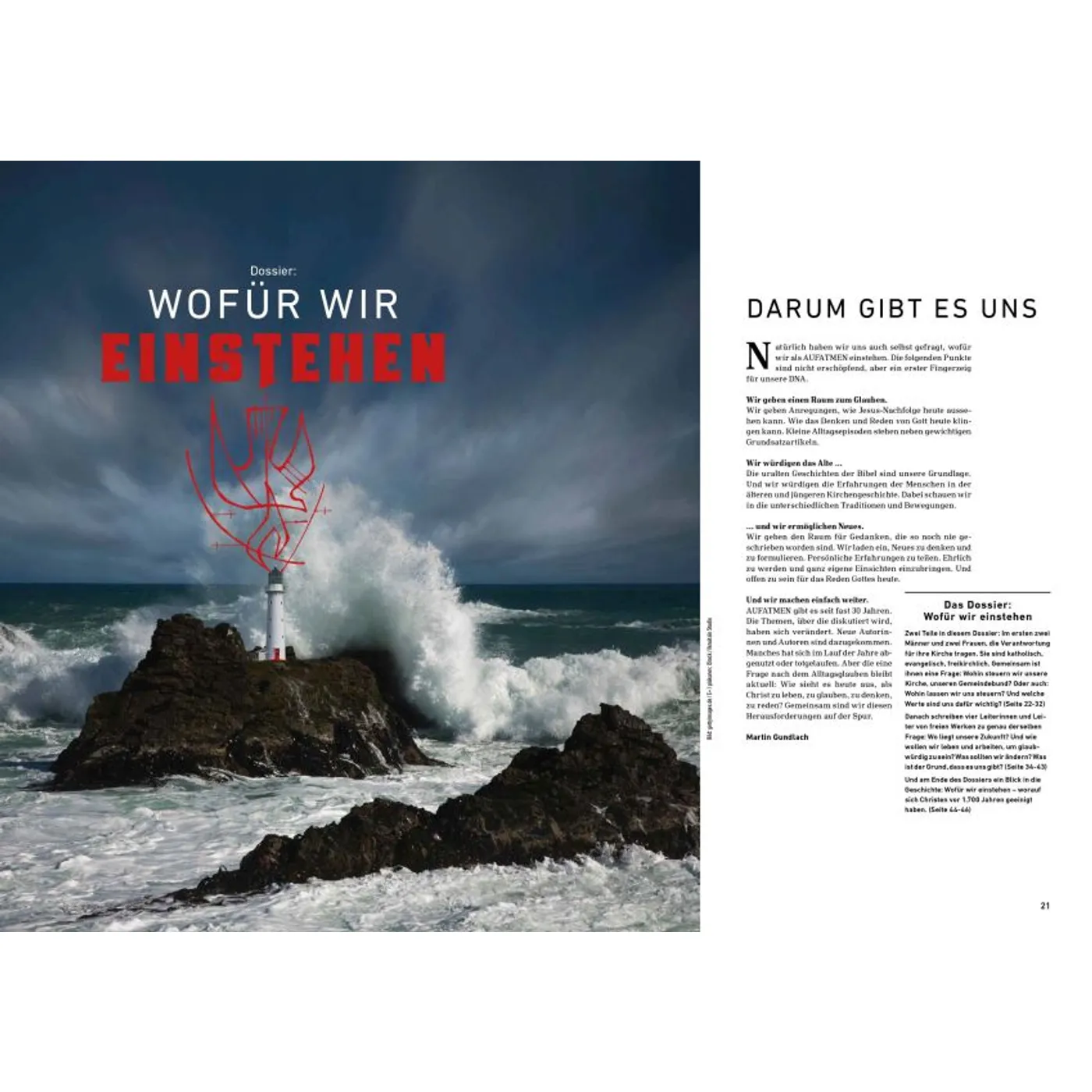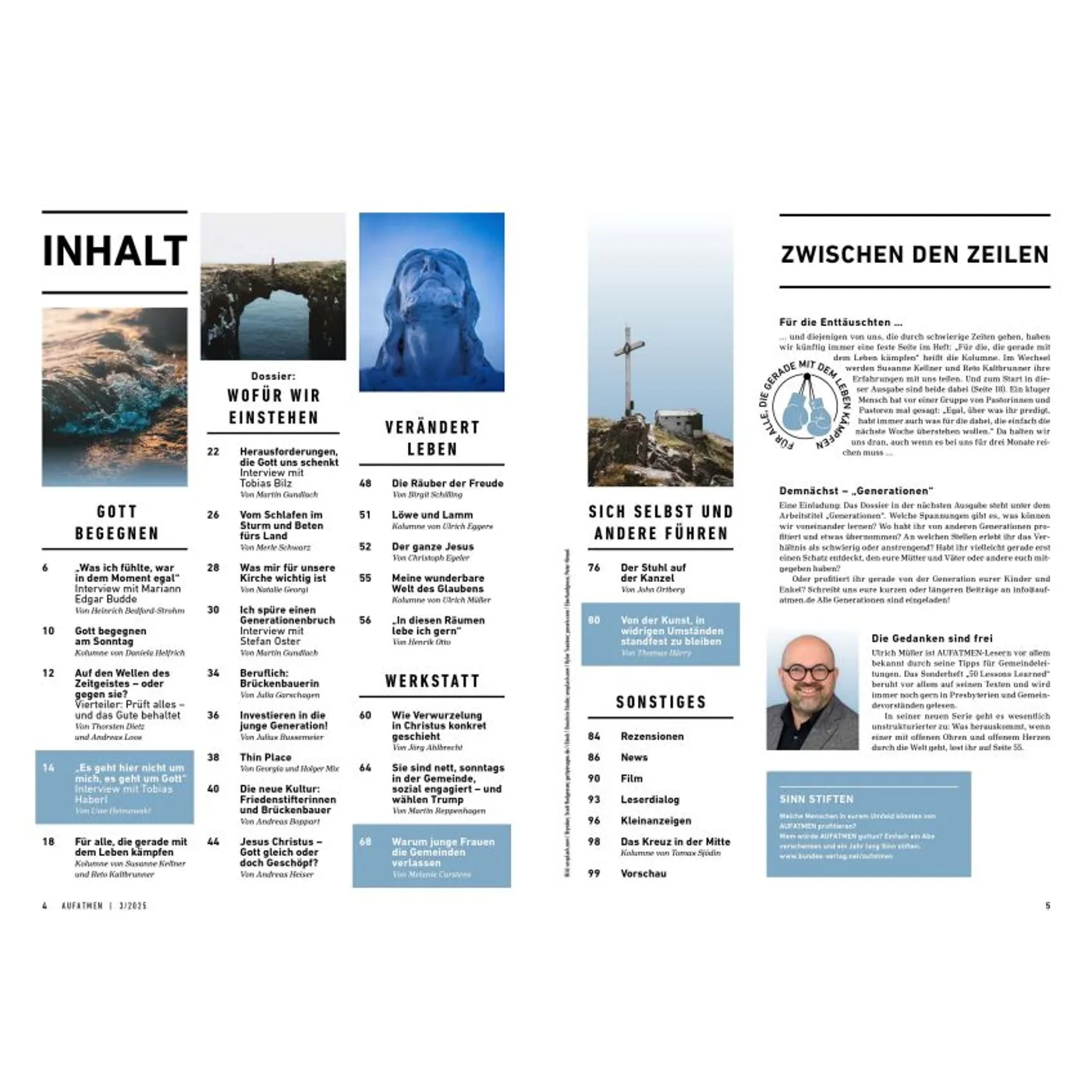 Gottes Wirklichkeit erfahren AUFATMEN ist das Magazin für Frauen und Männer, die Gott tiefer vertrauen und persönlich wachsen wollen. In jeder Ausgabe finden sich ehrliche Porträts, inspirierende Gottes-Erfahrungen, persönliche Einblicke und Herausforderungen für Kopf und Herz. Besonders für seine offenen authentischen Berichte über Fragen, Zweifel und Neuanfänge ist das AUFATMEN-Magazin bekannt. Die Zeitschrift fordert dazu heraus, mitten im Alltag aufmerksam zu werden für Gottes Gegenwart und Wirken. Hin zu einem Glauben, der immer weiter, freier und tiefer wird. Neue Horizonte öffnen In jeder Ausgabe gibt es ein Dossier, das Fragen vertieft bearbeitet und neues Denken anstößt. Themenschwerpunkte sind beispielsweise „Einheit“, „Heimat“, „Gott hören“ oder „Scham“. Außerdem in jedem Heft: „Werkstatt Gemeinde“ mit Tipps und Erfahrungswerten für Menschen, die aktiv Kirche und Gemeinde gestalten wollen. Was andere über AUFATMEN sagen: „Wer etwas tun möchte für Lebendigkeit und Mündigkeit seines Glaubens, liegt bei AUFATMEN genau richtig: Die Lektüre ist immer wieder anregend, bewegt sich jenseits ausgetretener Pfade, fordert heraus und macht Beine!“ Prof. Dr. Michael Herbst, Universität Greifswald