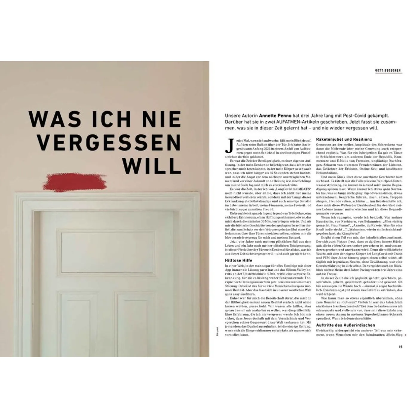 Gottes Wirklichkeit erfahren AUFATMEN ist das Magazin für Frauen und Männer, die Gott tiefer vertrauen und persönlich wachsen wollen. In jeder Ausgabe finden sich ehrliche Porträts, inspirierende Gottes-Erfahrungen, persönliche Einblicke und Herausforderungen für Kopf und Herz. Besonders für seine offenen authentischen Berichte über Fragen, Zweifel und Neuanfänge ist das AUFATMEN-Magazin bekannt. Die Zeitschrift fordert dazu heraus, mitten im Alltag aufmerksam zu werden für Gottes Gegenwart und Wirken. Hin zu einem Glauben, der immer weiter, freier und tiefer wird. Neue Horizonte öffnen In jeder Ausgabe gibt es ein Dossier, das Fragen vertieft bearbeitet und neues Denken anstößt. Themenschwerpunkte sind beispielsweise „Einheit“, „Heimat“, „Gott hören“ oder „Scham“. Außerdem in jedem Heft: „Werkstatt Gemeinde“ mit Tipps und Erfahrungswerten für Menschen, die aktiv Kirche und Gemeinde gestalten wollen. Was andere über AUFATMEN sagen: „Wer etwas tun möchte für Lebendigkeit und Mündigkeit seines Glaubens, liegt bei AUFATMEN genau richtig: Die Lektüre ist immer wieder anregend, bewegt sich jenseits ausgetretener Pfade, fordert heraus und macht Beine!“ Prof. Dr. Michael Herbst, Universität Greifswald