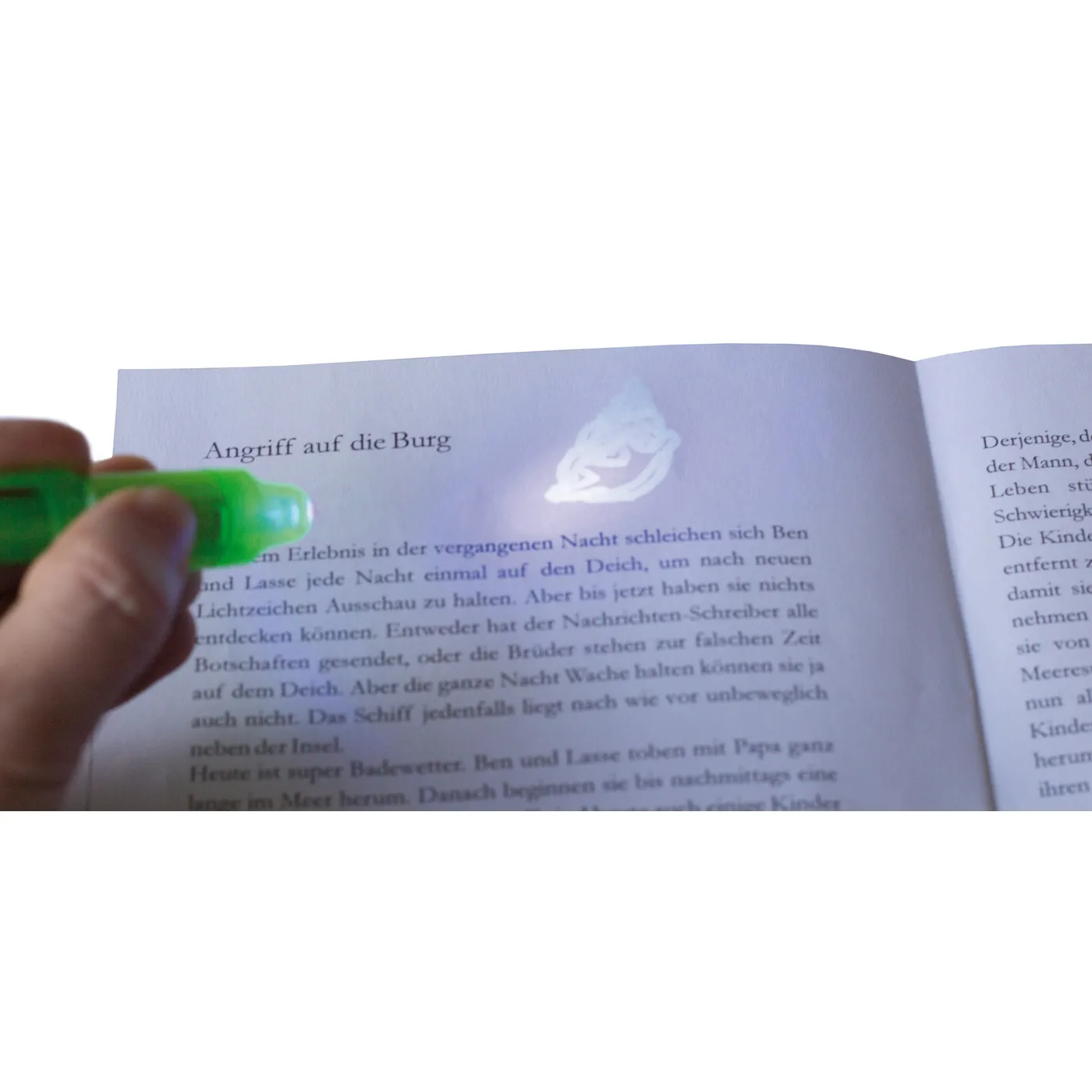 Das Buch ist sehr schön gestaltet und mit dem beigelegten UV Stift, kann man viele geheime Botschaften und die Rätsellösungen entdecken. Für Kinderhände ist der Stift manchmal nicht so leicht zu händeln, aber wenn man die Seiten schräg zum Licht hält, kann man auch alles lesen und entdecken.