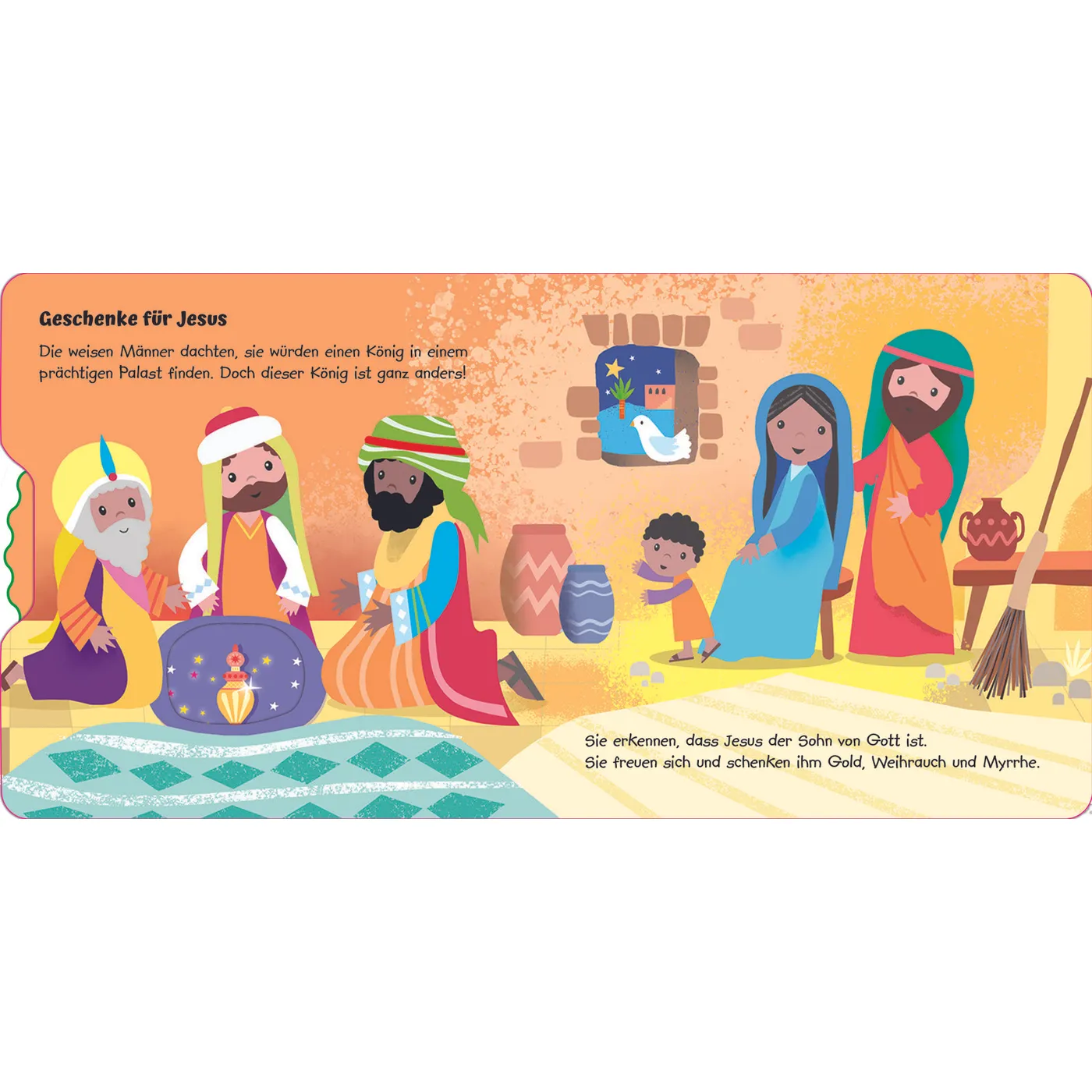 Zusätzlich bieten die Spielelemente einen hohen Aufforderungscharakter, um unbedingt das gesamte Buch anzuschauen. Über die vergebliche Suche nach einem Schlafplatz, der Ankündigung der Engel und dem Besuch der Hirten und schließlich dem der weisen Männer mit den Geschenken für das Jesuskind wird die Geschichte vervollständigt. Jede Doppelseite besteht aus einer Überschrift und einem kurzen Text, der in einfachen Worten erzählt wird.