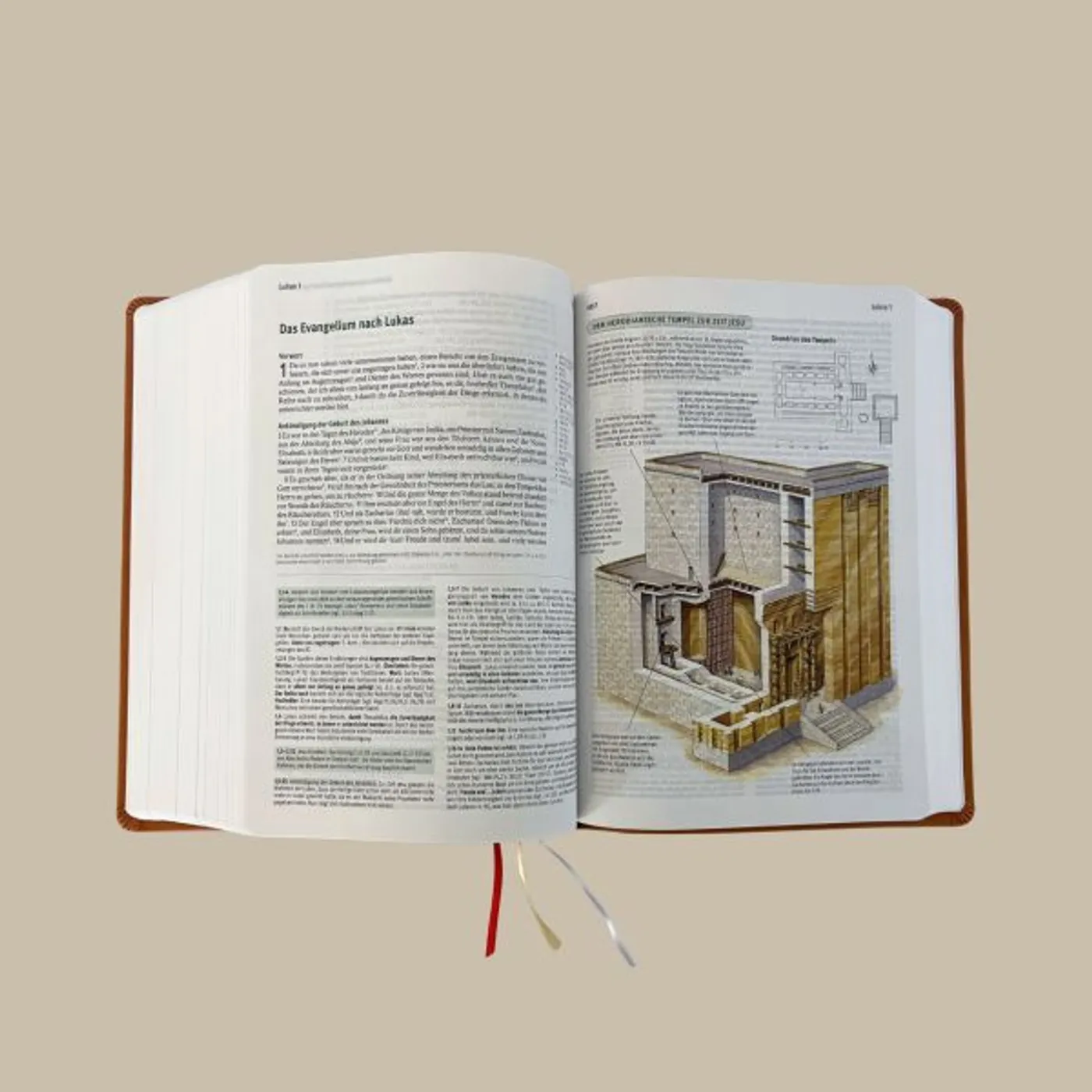 Mehr als 20.000 Anmerkungen erläutern Begriffe, zeigen Querverbindungen und beleuchten sprachliche Feinheiten. Ergänzt wird dies durch farbig hervorgehobene Einleitungen, die den roten Faden jedes biblischen Buches sichtbar machen. Hinzu kommen über 50 thematische Artikel zu zentralen Fragen von Theologie, Geschichte und Ethik. Damit deckt diese Studienbibel sowohl exegetische als auch systematisch-theologische und praktische Dimensionen ab – etwas, das andere Ausgaben selten leisten.
