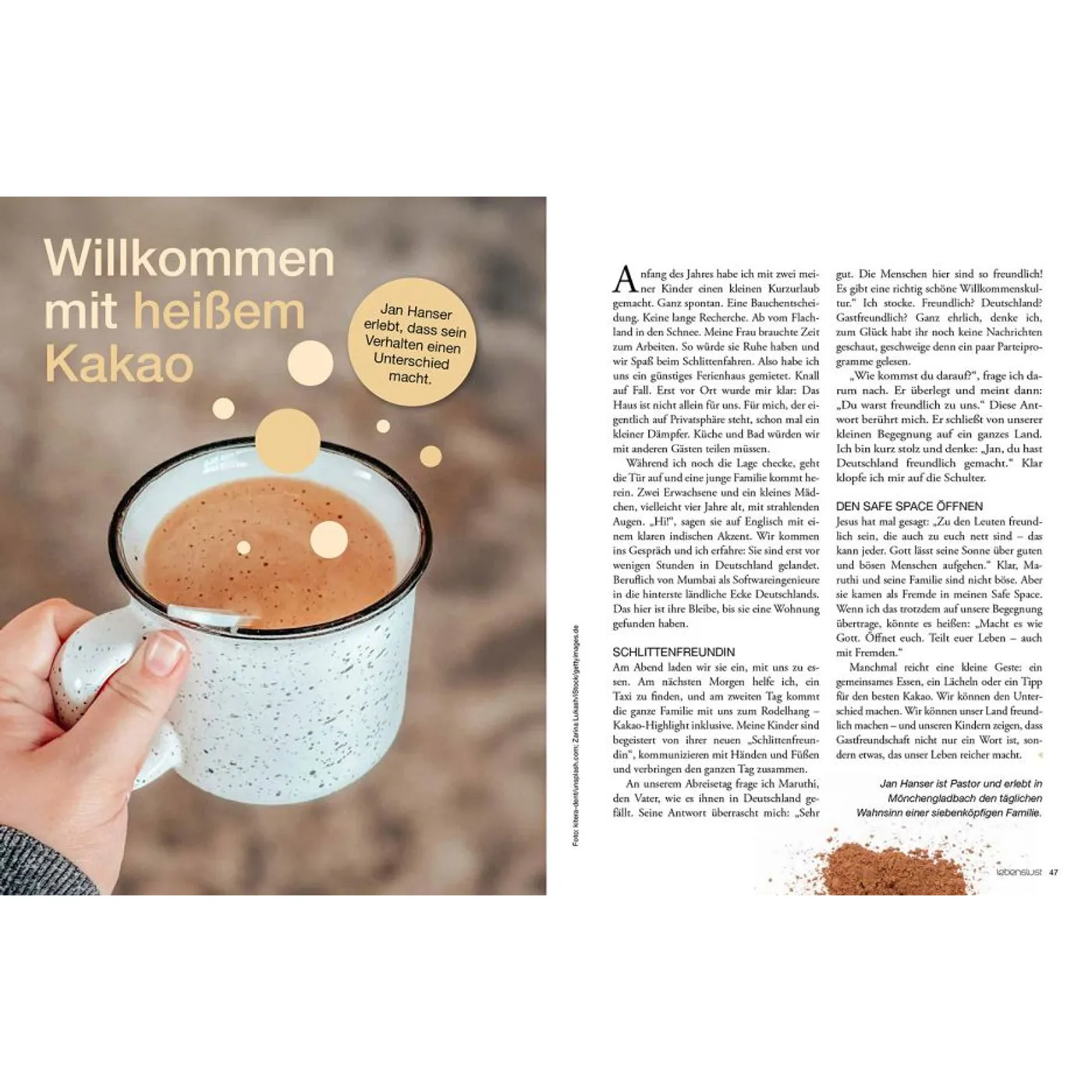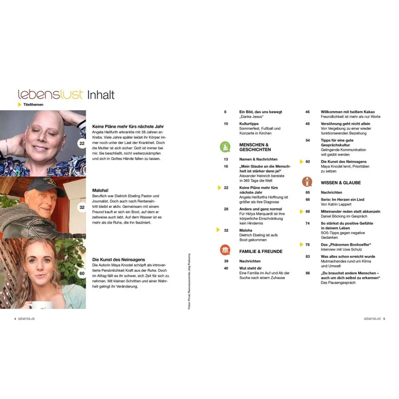 Die bunt-gestaltete lebenslust-Zeitschrift im A5-Format ist extra dafür gemacht, sie an Freunde und Bekannte weiterzugeben. Sie erzählt von interessanten Menschen, von spannenden Reisen, neuen Projekten und berichtet schlichtweg darüber, wie das Leben so spielt. Dabei spricht lebenslust ganz natürlich über den Glauben an Gott. Der bunte Mix aus ehrlichen Erfahrungsberichten, bewegenden Interviews, leckeren Rezepten, Rätseln und interessanten Neuigkeiten macht lebenlust zu einem wertigen kleinen Geschenk, das man gerne weitergibt. Mit lebenslust wird Glauben weitergeben ganz leicht Wer gerne in der Nachbarschaft, auf der Arbeit, in der Bäckerei oder beim Stammfriseur den Glauben zum Thema machen möchte, für den ist lebenslust das richtige. Für große und kleine evangelistische Aktionen kann lebenslust zu günstigen Mengenpreisen bestellt werden. Beispielsweise auch gemeinsam mit dem Hauskreis, der Frauengruppe oder dem Evangelisationsteam der Gemeinde. Was andere über lebenslust sagen: „Wir nutzen lebenslust als „Mitgebsel“, wenn Gäste in unsere Gottesdienste oder in unser offenes Stadtteil-Café kommen. Die Reaktionen sind meist sehr positiv – die Leute sehen in diesem Geschenk eine echte Wertschätzung.“ Tim Linder, Pastor der FeG Bochum- Langendreer