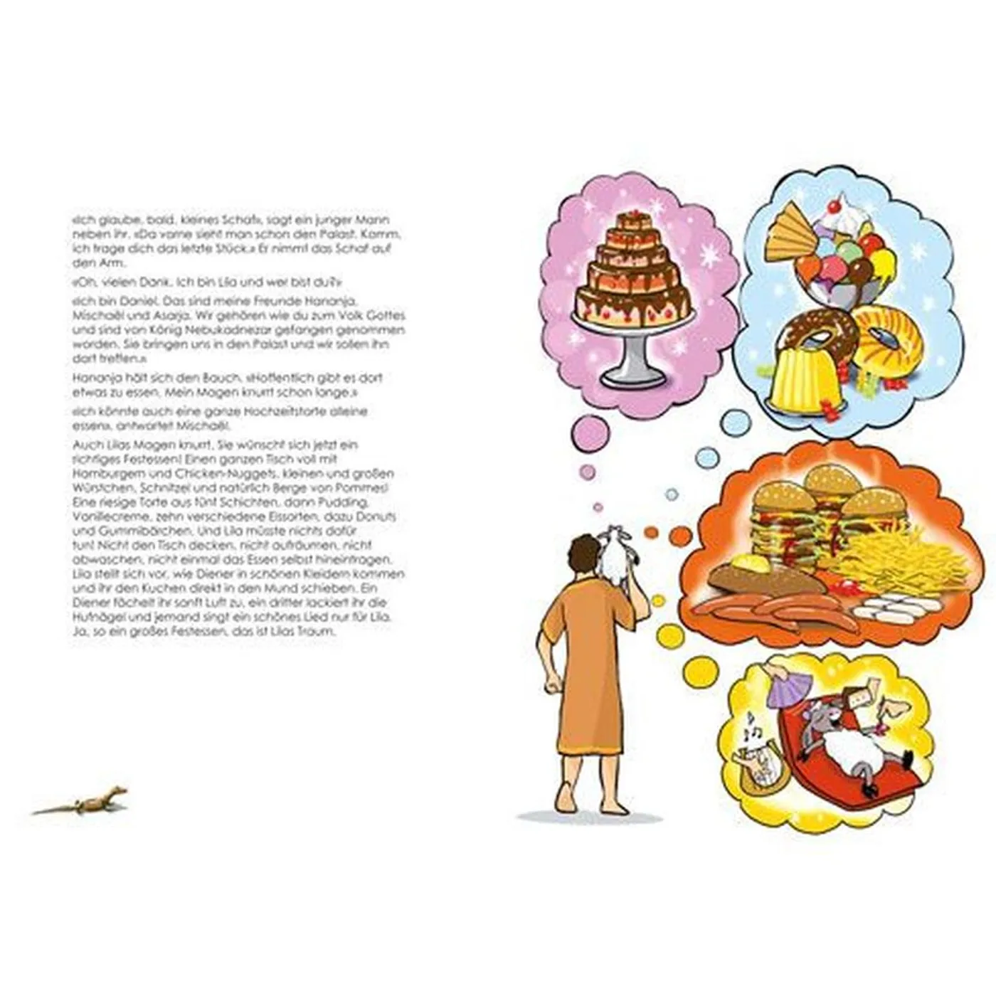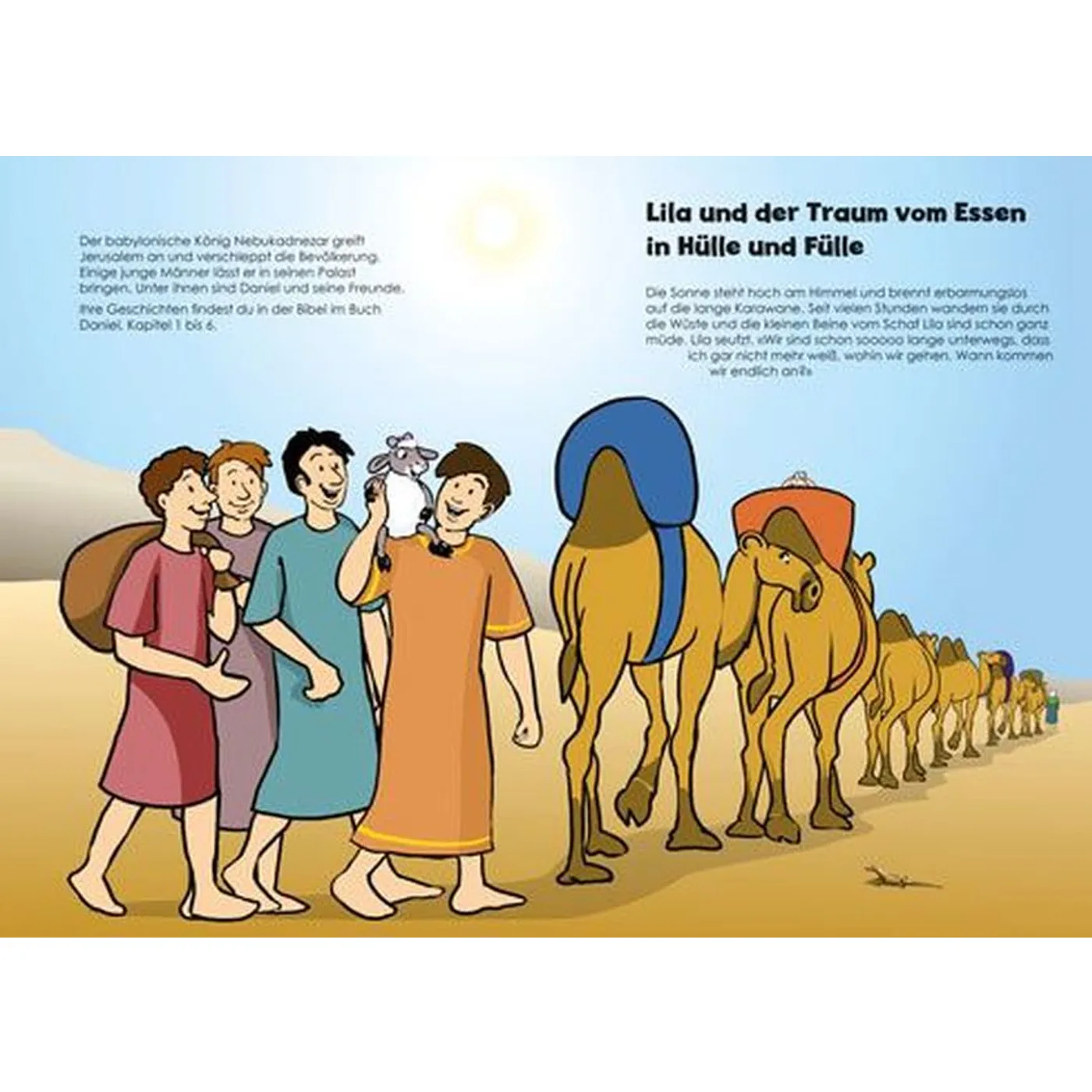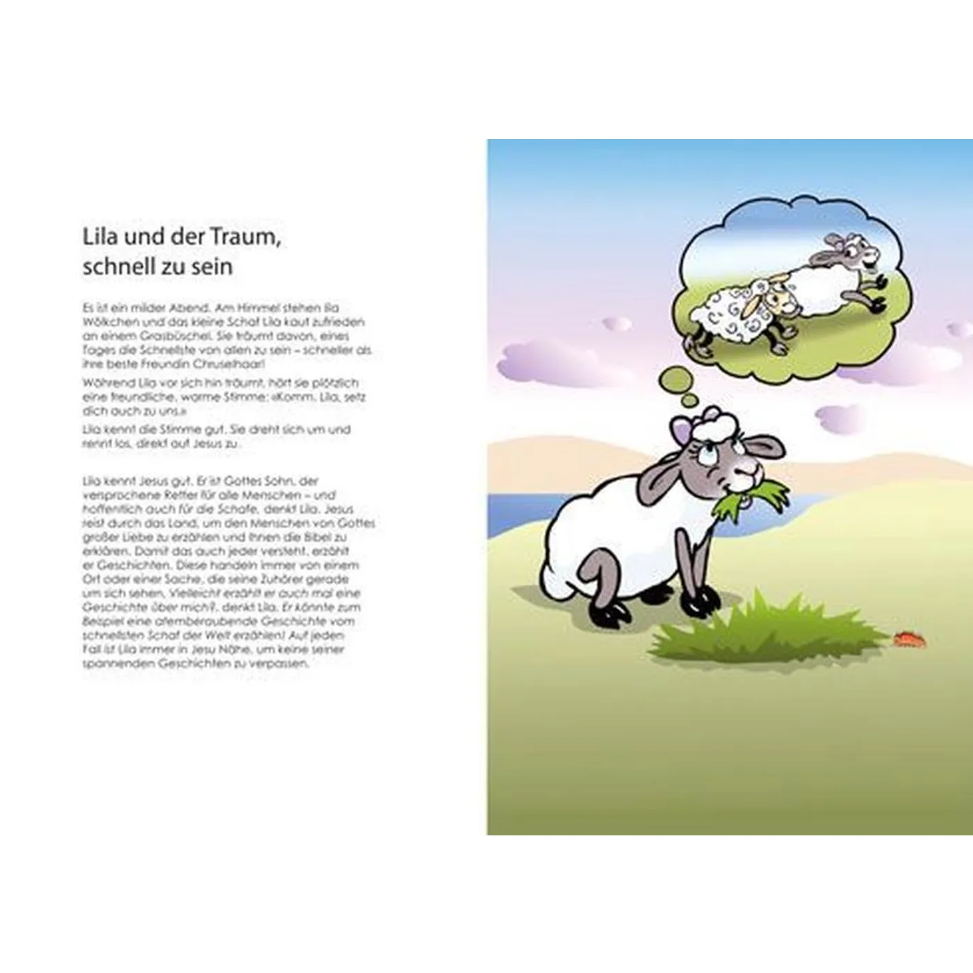 Das Schaf Lila liebt Abenteuer. Diese findet sie auf ihren Reisen mit Jesus. In jeder der fünf Geschichten geht einer ihrer Träume in Erfüllung. Ihr Traum, besonders schnell zu sein, erfüllt sich im Gleichnis vom verlorenen Schaf. Ihr Traum, stark zu sein, erfüllt sich bei der Heilung an Bartimäus. Ihr Traum vom Fliegen erfüllt sich, als sie mit dem gelähmten Mann auf der Bahre durch das Dach ins Haus fliegt. Als Kapitänin segelt sie mit Jesus über den See Genezareth und ihr Wunsch, einmal ein Autogramm von einem berühmten Menschen zu bekommen, erfüllt sich, als Jesus die Kinder segnet. Das Schaf Lila bringt uns die biblischen Geschichten mit Humor und Tiefgang näher.