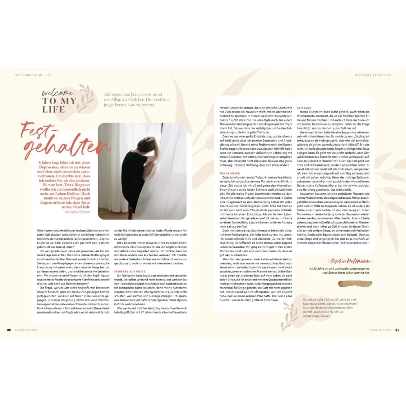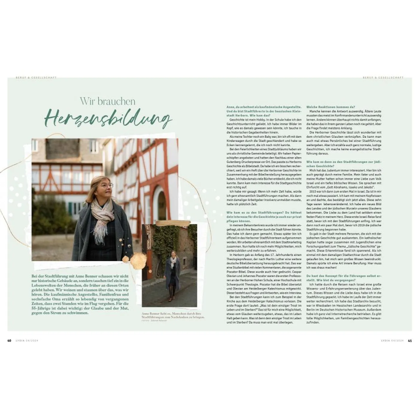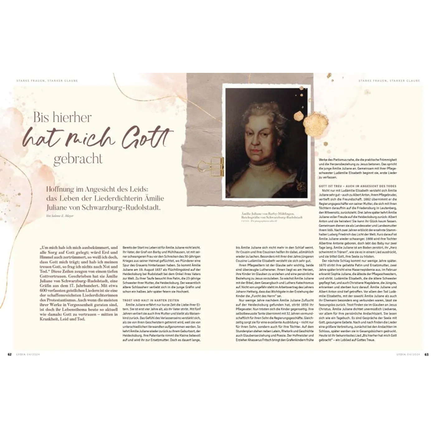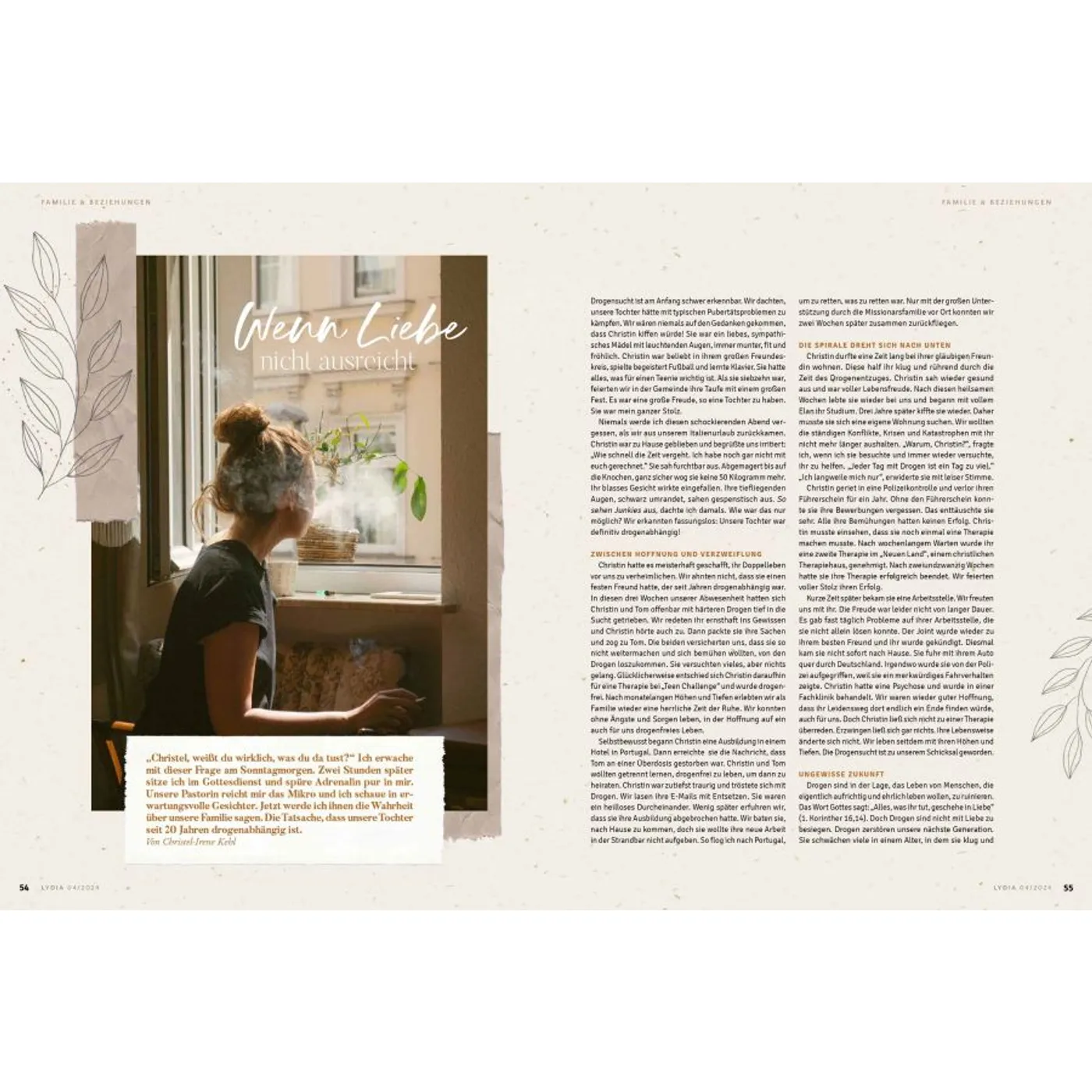 Lydia lädt Frauen ein, das Leben zu teilen und miteinander unterwegs zu sein. In den schönen Momenten aber auch in Zeiten der Angst und Sorge weist sie auf den hin, der Hoffnung und Sinn gibt: Jesus. Die Zeitschrift begleitet und ermutigt Frauen in den verschiedenen Lebensphasen – über die Grenzen von Konfessionen und Generationen hinweg. Auf dieser Plattform können Frauen voneinander lernen und sich gegenseitig beraten, egal ob Single, junge Mutter, Berufstätige oder Seniorin. Durch persönliche Erfahrungsberichte und Ratgeberartikel erleben die Leserinnen Gottes Handschrift ganz nahbar und bekommen wertvolle Impulse für den Alltag. Lydia bietet 4 x im Jahr: • Ermutigung im Glauben & Lebenshilfe durch den Austausch mit anderen Frauen • Geistliche Impulse, die Körper & Seele stärken • Ehrliche Einblicke, wie Familie & Beziehungen gelebt werden können • Inspirierende Berichte, wie Frauen in Beruf & Gesellschaft einen Unterschied machen