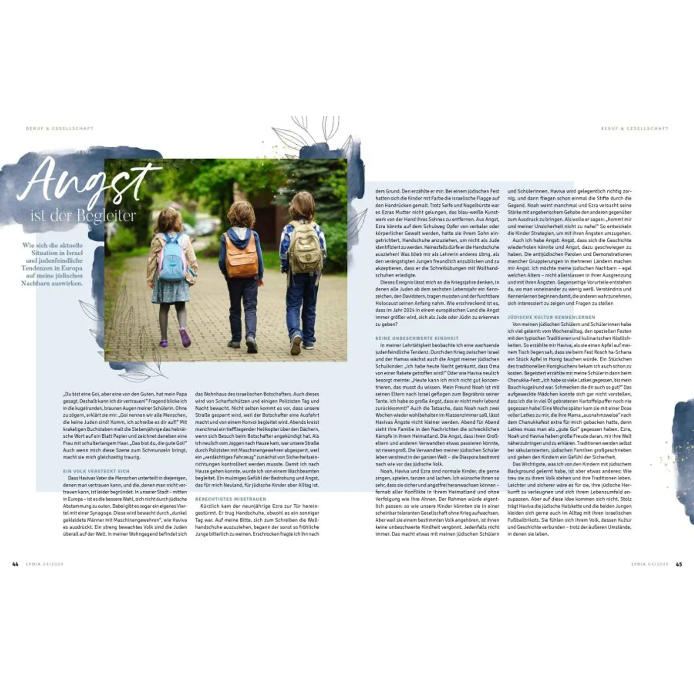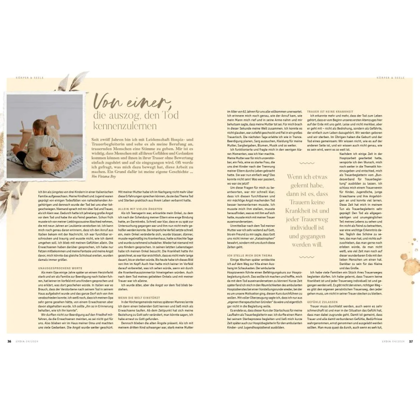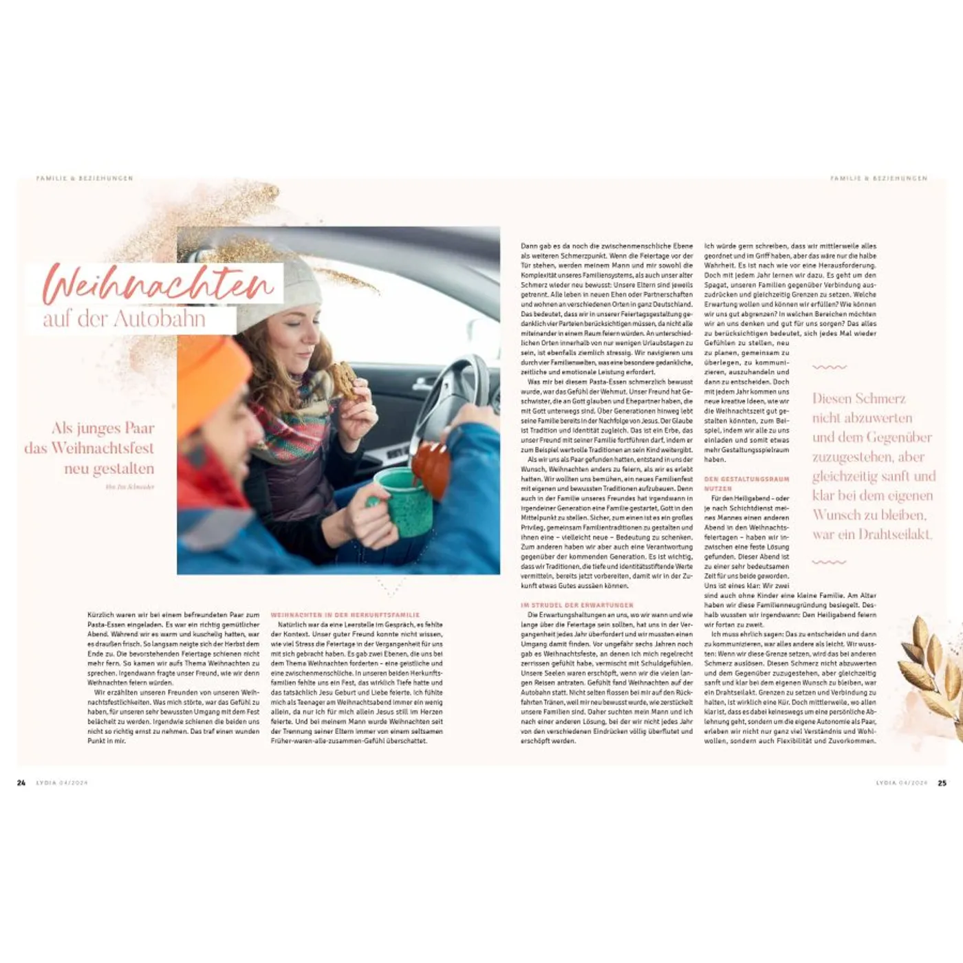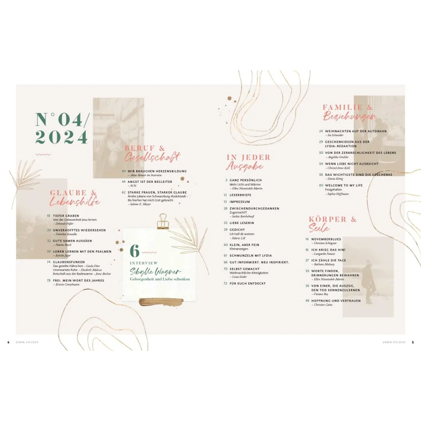 Lydia lädt Frauen ein, das Leben zu teilen und miteinander unterwegs zu sein. In den schönen Momenten aber auch in Zeiten der Angst und Sorge weist sie auf den hin, der Hoffnung und Sinn gibt: Jesus. Die Zeitschrift begleitet und ermutigt Frauen in den verschiedenen Lebensphasen – über die Grenzen von Konfessionen und Generationen hinweg. Auf dieser Plattform können Frauen voneinander lernen und sich gegenseitig beraten, egal ob Single, junge Mutter, Berufstätige oder Seniorin. Durch persönliche Erfahrungsberichte und Ratgeberartikel erleben die Leserinnen Gottes Handschrift ganz nahbar und bekommen wertvolle Impulse für den Alltag. Lydia bietet 4 x im Jahr: • Ermutigung im Glauben & Lebenshilfe durch den Austausch mit anderen Frauen • Geistliche Impulse, die Körper & Seele stärken • Ehrliche Einblicke, wie Familie & Beziehungen gelebt werden können • Inspirierende Berichte, wie Frauen in Beruf & Gesellschaft einen Unterschied machen