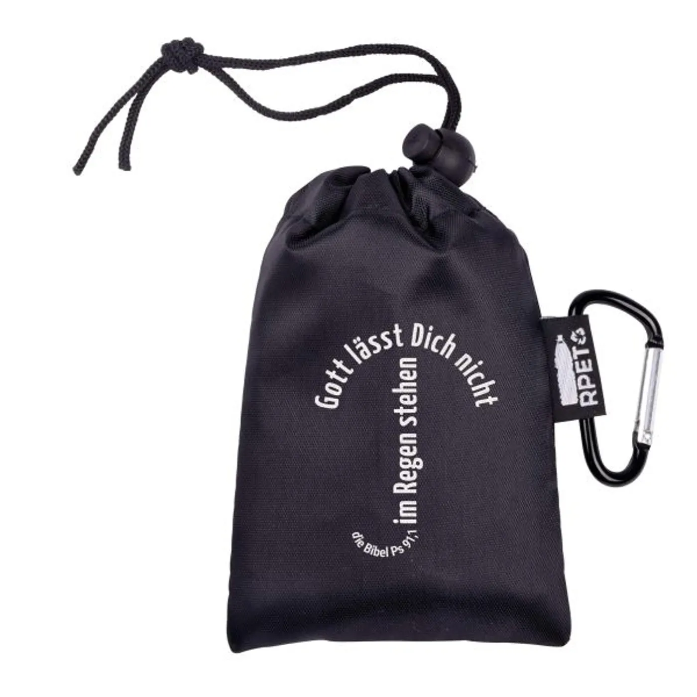 Besonders praktisch: Der Poncho wird in einem kleinen RPET-Beutel geliefert, der mittels eines Karabiners befestigt werden kann. So hat man den Poncho immer griffbereit zur Hand.
