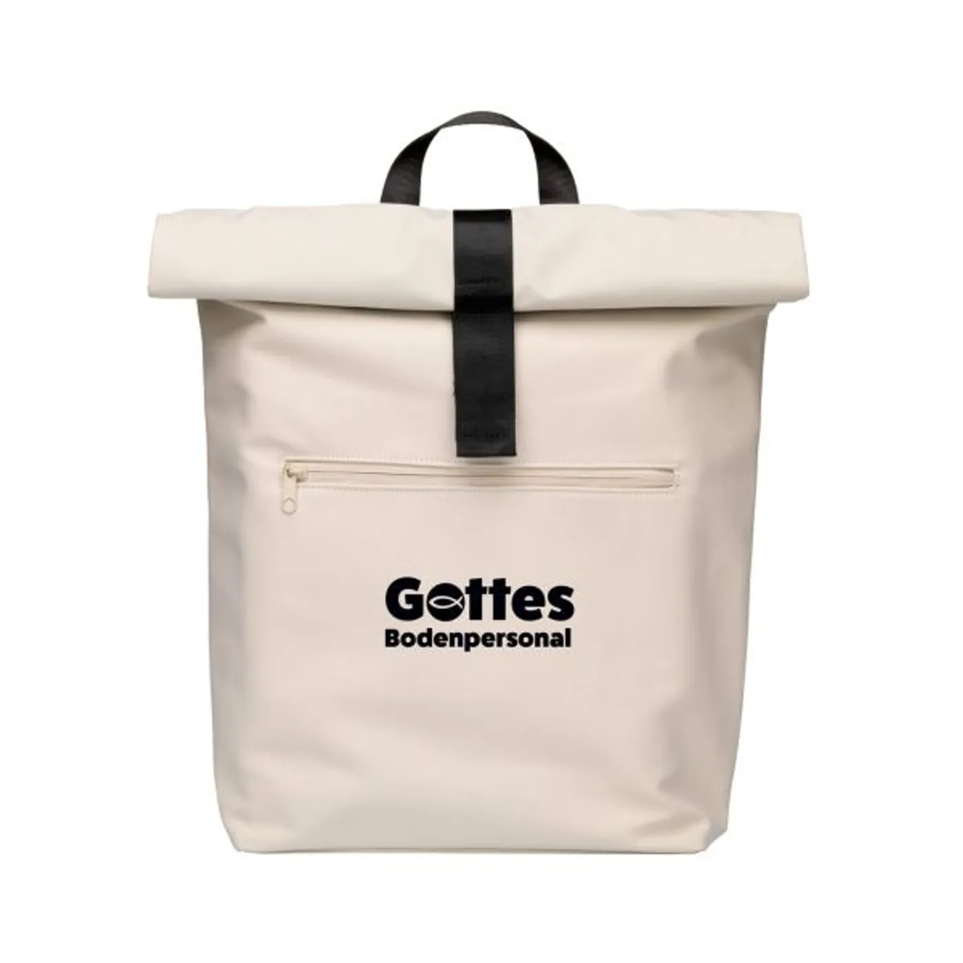 Robuster „Rolltop“-Laptop-Rucksack aus wasserabweisendem PU, hergestellt aus recyceltem Material (RPET) und bedruckt mit der beliebten Serie „Gottes Bodenpersonal“.