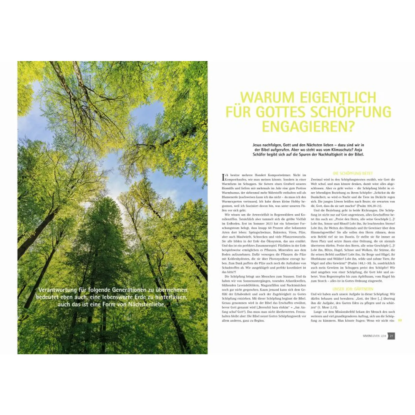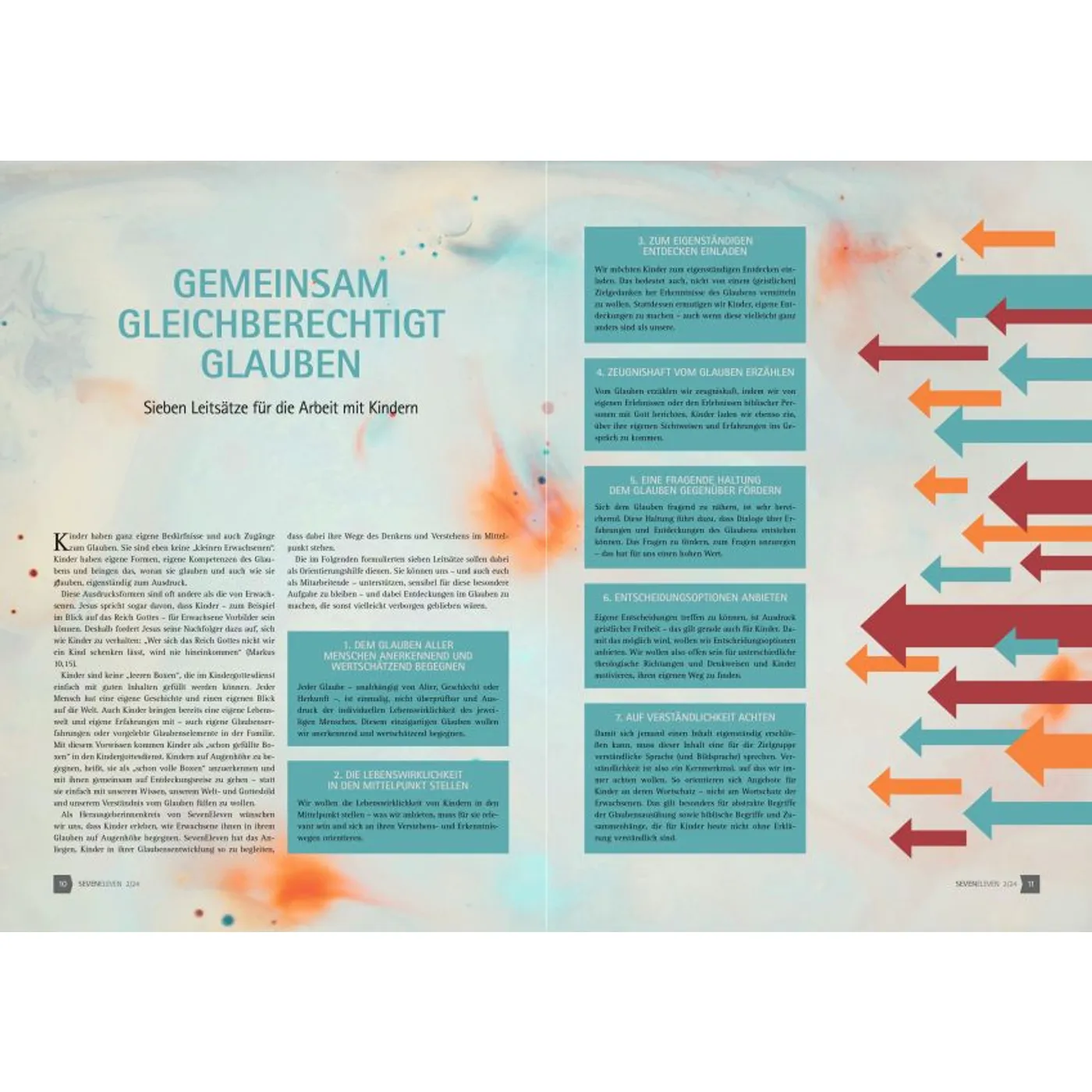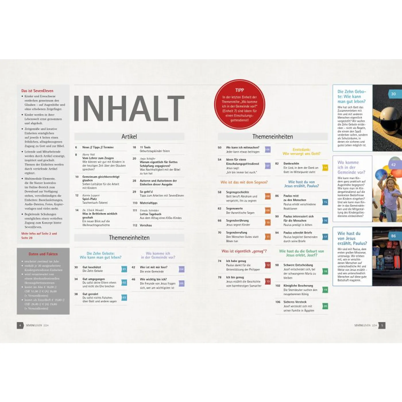 SevenEleven ist das Materialheft für Kindergottesdienstmitarbeiter, die mit 7- bis 11-Jährigen die Welt der Bibel erforschen wollen. Das Magazin bietet zweimal im Jahr zeitgemäße und kreative Einheiten, die einen fröhlichen, alltagsbezogenen Zugang zu Gott und der Bibel möglich machen. Jede Ausgabe enthält 20 ausgearbeitete Einheiten, die die Kinder mitten in ihrer Lebenswelt abholen und erstnehmen. SevenEleven möchte dabei helfen den Kindern eine Tür zu Gott, dem Glauben an ihn und der Bibel zu öffnen. Hilfreiche Praxistipp und Hintergrundinfos zum tiefer eintauchen Leitende und Mitarbeitende in der Kindergottesdienstarbeit werden durch begleitende Artikel ermutigt, inspiriert und geschult. Zusätzlich gibt es für die Vorbereitung der Themen vertiefende Fragen, sowie Hintergrundinfos zum Bibeltext. Überkonfessionelles Autorenteam Die Zeitschrift ist bewusst überkonfessionell gehalten und die Autoren von SevenEleven gehören zu verschiedenen Landes- und Freikirchen.