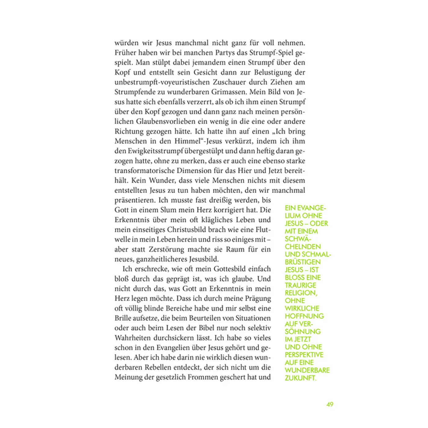 Das Buch hat mich in den ersten zwei Kapiteln sehr gepackt. Mit Kapitel drei und vier habe ich mich persönlich sehr schwer getan, danach wurde ich wieder gepackt. In den beiden Kapiteln hat er mir die Bibelgeschichten zu flapsig erzählt außerdem ist er dort vom Schreibstil sehr umgangssprachlich geworden und da das Buch für schon Gläubige geschrieben ist, wird hier zu sehr für den christlichen Glauben geworben.